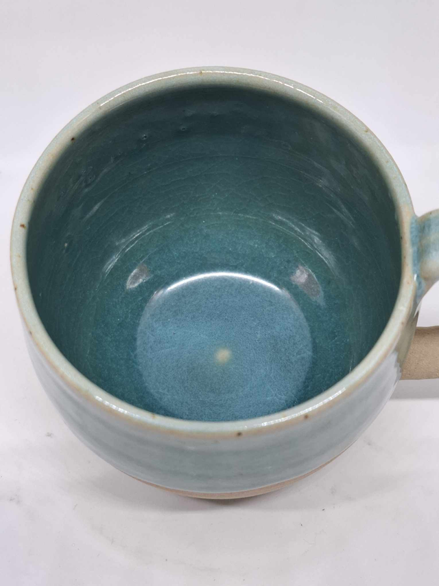 Abysse Azur 08 est une tasse de 30 cl, façonnée à la main dans mon atelier. Recouverte d’un émail bleu-vert profond, elle révèle une texture à la fois lisse et marquée par une ligne subtile entre l'émail et le grès brut. Son anse crantée en fait une pièce unique offrant une prise en main particulière et personnelle. Avec des dimensions de 9 cm de hauteur et 8.5 cm de diamètre, cette tasse vous invite à un rendez-vous intime, une bulle de réconfort.