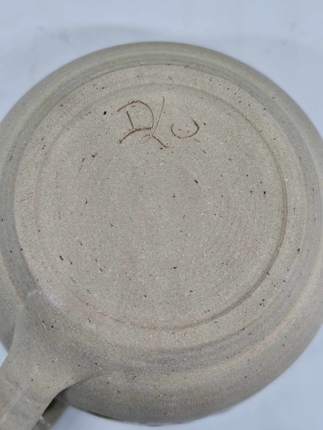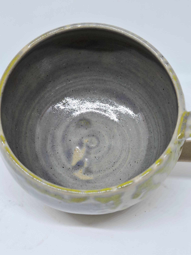 Pièce unique tournée dans mon atelier. Émail Croco Citronné, aux nuances allant du vert profond au bleu-gris, avec des touches de jaune doré. Cette tasse mesure 7.5 cm de hauteur et 10 cm de diamètre, pour une capacité de 40 cl. L'effet craquelé, obtenu par cuisson haute température, la rend absolument unique et non reproductible. Parfaite pour une boisson généreuse, elle ajoutera une touche élégante et artistique à votre quotidien.